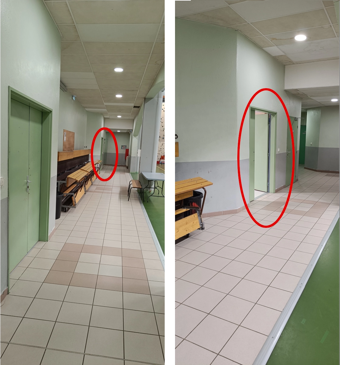 - Une fois passé le couloir d’entrée, dirigez-vous jusqu’à la salle principale. le Dojo est dans la salle de gauche, la salle principale du gymnase est sur votre droite